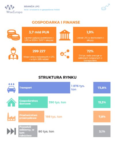 Jakie znaczenie gaz płynny LPG ma dla polskiej gospodarki? Gaz płynny LPG to energia, która napędza codzienność gospodarki. To nie tylko 3 miliony samochodów zasilanych autogazem i ogrzewanie dla 150 tys. gospodarstw domowych. Nowy raport WiseEuropa wskazuje, że LPG to praca 300 tys. osób w całej Polsce i ponad 3 mld zł podatków wpływających do Skarbu Państwa.